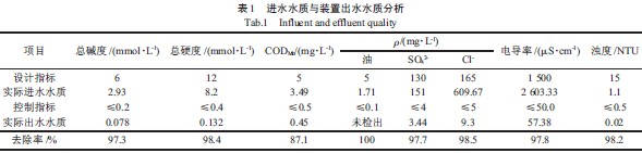 由表1 可以看出,進水中的總堿度、總硬度、濁度、油含量和CODMn等指標沒有超出設計指標;進水中Cl-設計指標165 mg/L,實際進水為609.67mg/L,超出設計指標近2~3 倍;SO42-也超出設計進水指標;由此導致進水電導率由設計時指標1 500μS/cm 上升到目前平均2 603.33 μS/cm 左右,超出設計進水水質指標73.5%。