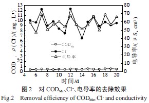由表1 可以看出,總堿度、總硬度、含油量、SO42-和濁度的去除率均在95%以上,出水完全達到設計指標的要求。由表1 和圖2 可以看出,出水CODMn平均為0.45 mg/L,去除率為87.1%,去除效果良好,達到設計標準,但是從連續20 d 的分析數據看偶爾有少量超標。由表1 可見,Cl-的出水平均值為9.3mg/L,去除率為98.5%;電導率的出水平均值為57.38 mg/L,去除率為97.8%,但是均未達標。由圖2可以看出,出水Cl-和電導率值大部分時間都有一定的超標,分析其主要原因在于進水水質高于設計值,對裝置運行和處理效果會產生較大影響,因此需要控制好進水水質。