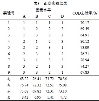 采用正交實(shí)驗(yàn),選用L9(34)正交表,考察酸改性粉煤灰、H2O2和FeSO4的加入量、反應(yīng)時(shí)間對(duì)COD去除率的影響,正交實(shí)驗(yàn)因素水平見表2,正交實(shí)驗(yàn)結(jié)果見表3。