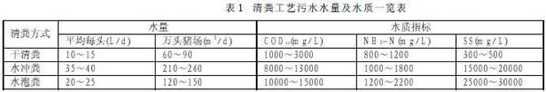 養殖廢水具有典型的“三高”特征,CODcr高、氨氮高、SS高,以豬場為例,3種清糞工藝污水水量及水質調查情況如下表1所示。