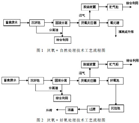 畜禽養殖廢水一般需要多種處理技術的結合。從治理技術來看,要實現去除CODcr、BOD5的同時,再脫氮除磷的效果,厭氧工藝是不可或缺的。目前我國畜禽養殖廢水的治理主要有兩種模式:一種是厭氧-自然處理模式,適用于中小型規模化養殖場;另一種是厭氧-好氧利用模式,適用于大中型畜禽養殖場或養殖區。