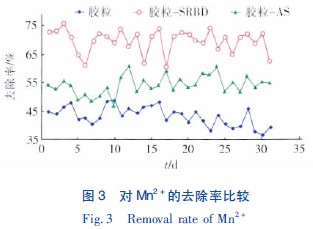 膠粒、膠粒-SRBD 柱、膠粒-AS 柱對Mn2+的平均去除率分別為43.6%、70%、54.2%。膠粒對Mn2+的去除機理同Fe2+,但膠粒對Mn2+的選擇性可能弱于Fe2+,因而去除率較Fe2+的低。同樣在生物柱中Mn2+的去除依靠生物吸附、化學沉淀以及膠粒吸附作用,但據張金蓮等的研究表明,當Mn2+濃度為4 mg /L 時其會對脫氫酶活性產生抑制作用,并且隨著時間的延長,抑制作用越來越明顯,使微生物對Mn2+的吸附容量減小,加之膠粒對Mn2+的吸附能力較差,所以生物柱對Mn2+的去除能力較對Fe2+的差。由于膠粒-SRBD 柱中硫酸鹽還原作用產生了大量的S2-,Mn2+得以化學沉淀被去除,因此膠粒-SRBD 柱對Mn2+的去除效果好于膠粒-AS柱。具體參見http://www.bnynw.com更多相關技術文檔。