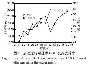 由圖2 可以看出,改良UASB進水COD在1000~3 000mg/L 波動,啟動前期COD 的去除率較低,主要因為微生物需要適應改變的生存環境。在隨后的時間里,微生物逐漸適應反應器內部環境,COD 去除率在不斷上升,在第20 天COD 去除率為82%。從圖2 中明顯的可以看出,去除率有3 次不同的下降,這是因為反應器負荷提升的原因,但又在短時間內恢復。在第35 天后,進水COD 的負荷從2 000mg/L 升至3 000mg/L 后,去除率出現了較大的波動從89%下降至74%。但在第45 天反應器的去除率又達到了82%,說明反應器的抗沖擊負荷強,微生物的活性也是最佳的狀態。同時在提升進水負荷的同時也縮短了HRT,由剛啟動時期的16 h 縮短至4 h,啟動前35 天采用的是間歇模式,COD 去除率均值為78.6%;后25 天采用連續進水,HRT=4 h,COD 去除率均值在82.6%。在第35 天已經發現有大量的顆粒污泥存在,這標志著反應器啟動成功;同時UASB反應器的容積負荷達到了20.16 kg/(m3·d)。也就是說反應器啟動利用微攪動間歇模式啟動,可以較為快速的啟動成功。