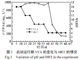 該反應器啟動采用2 種模式啟動,先間歇后連續,所以在2 種啟動模式下VFA 和HRT 是不同的。啟動運行期VFA 的變化與HRT 的情況如圖3 所示。