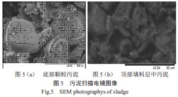 污泥掃描電鏡圖像如圖5 所示。圖5(a)為該顆粒污泥是底部顆粒污泥樣品:顆粒污泥呈現圓盤形態,盤面布滿很多小孔,可以設想泥核內部結構不是緊促密實,而是含有通道的蓬松結構。一部分廢水在顆粒污泥表面積上發生降解反應;而另一部分廢水通過盤面通道進入核心與核內微生物發生生化反應,同時通過通道輸出廢物和生化反應所產生的CH4和CO2,這樣可以大大提高微生物的去除效率。圖5(b)為頂部填料層中污泥電鏡圖,可以清晰的觀察到該污泥層是以棒狀桿菌和絲狀菌為主。而頂部污泥層是底部污泥層中較小顆粒上浮,通過填料層截留下來形成的。一方面降低了出水中的細小物質,另一方面對廢水進行二次類似生物膜去除。