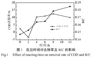 取5 份500 mL 的水樣,調節廢水pH 為6.5,固定化漆酶投加量為0.2 g/L,CuSO4投加量為10mg/L,HBT 介體的投加量為4 mg/L,在25 ℃下曝氣反應0、2、4、6、8、12 h 后分別測定COD 和BOD5,從而確定最佳反應時間。COD 去除率和B/C 隨時間變化如圖1 所示。