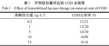 由表1 可知,漆酶作為一種多酚氧化酶,它可催化氧化酚類或芳胺類等多種底物。氧化酚或芳胺時先失去一個電子生成自由基,后者發生一系列非酶反應,氧化成醌,在有O2存在時,還原態漆酶被氧化,O2還原成水。底物自由基不穩定,可進一步發生鍵的斷裂或生成,導致裂解或聚合反應。因此,底物分子可進一步聚合生成復雜的產物,也可催化芳香環支鏈Cα- Cβ鍵斷裂。木素中主要的易受漆酶攻擊的特征功能基是苯環上的酚羥基和甲氧基,尤其是酚羥基,特別容易受漆酶的攻擊。當固定化漆酶投加量為0.2 g/L 時,COD 去除率最高。