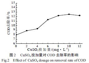 由圖2 可知,當CuSO4投加量為10 mg/L 時具有較高的COD 去除率,繼續增大投加量,COD 去除率反而下降。分析原因可能為高濃度的Cu2+ 可能與漆酶活性部位的酸性氨基酸殘基中的游離ω- 羧基陰離子結合,影響了漆酶分子的電荷分布及電子傳遞作用,從而減弱了活性中心與底物的結合反應速度,導致COD 去除率下降。本試驗在水樣pH 為5.5 的條件下控制CuSO4投加量為10 mg/L 可取得更高的COD 去除率。