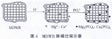 MDWR 除磷過程見圖4。酸解后產生的鈣鎂離子與水中的磷酸根反應,生成磷酸鎂、磷酸鈣沉淀。同時,MDWR 對鈣鎂離子與磷酸根具有良好的吸附作用,離子得到富集,沉淀速度較快。