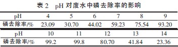 控制m(硫酸)∶m(MDWR)=1∶100,酸解時間5 min,沉淀除磷的pH 為10,考察MDWR 質量濃度(2~20 g/L)對磷去除率的影響(見表1)。結果顯示,磷的去除率隨廢渣投加量的增加而增加,當MDWR達到10 g/L 時,磷去除率達到95.34%,此后繼續增加MDWR,磷去除率增加不大。從工程應用角度考慮,MDWR 最佳投加質量濃度約為10 g/L。