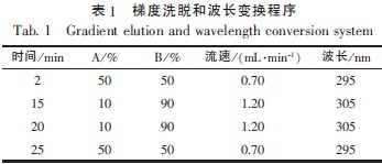 (3)色譜條件。色譜柱:Eclipse plus C18 柱,5 μm,4.6 mm× 150 mm;流動相:A:H2O(含1%乙酸),B:甲醇(含1%乙酸);進樣量:10 μL;梯度洗脫和波長變換程序見表1。