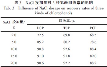 向液液萃取體系加入一定量的無機鹽可以降低水分子活度,降低被萃取物質與水的結合能力,從而提高萃取效率。NaCl 的投加量與氯酚回收率的影響關系見表3。從表3 可以看出,NaCl 的投加明顯提高了3 種氯酚的萃取效率。當NaCl 的投加量增加到10 g以上時,3 種氯酚的回收率趨于平穩,故確定NaCl 的最佳投加量為10 g。同時,水樣經硫酸酸化并加NaCl 處理,且二氯甲烷分2次萃取已經減輕了乳化現象,再將乳化部分轉移至清潔的分液漏斗減壓并用玻璃棒攪拌,取得了較理想的破乳效果。