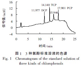 (2)流動相的選擇。向甲醇-水流動相中加入1%的乙酸可使以氯酚鹽存在的樣品轉化為氯酚,同時抑制氯酚的離子化,獲得較好的峰形。