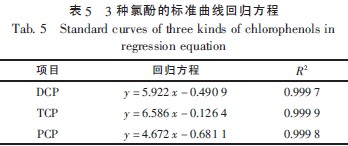 分別以3 種氯酚的濃度為橫坐標,以峰面積為縱坐標繪制標準曲線,線性關系良好,3 種氯酚的標準曲線回歸方程見表5。