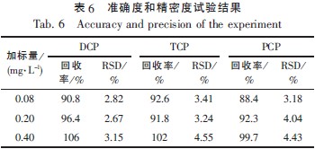 采用上述方法廢水中氯酚的回收率為88.4%~106%,測定結果的相對標準偏差為2.67%~4.55%。