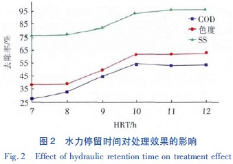 試驗過程中,每個HRT 下穩定運行一周,取所測數據的平均值進行分析。由圖2 可見,隨著HRT的增加,處理效果逐漸提高,但在達到10 h 后,對COD、色度和SS 去除率的增幅均減緩。因此,反應器的HRT 以10 h 為宜。