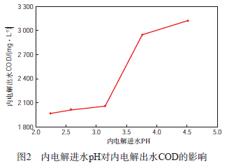 在內電解進水COD為3 812.4 mg/L、內電解HRT為1.0 h的條件下,內電解進水pH對內電解出水COD的影響見圖2。