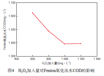 由圖4可見,隨H2O2加入量的增加,Fenton氧化出水COD先呈下降趨勢,但當H2O2加入量增至1 000 mg/L后,出水COD略有上升。這是因為,H2O2加入量過高時,在反應一開始就將Fe2+迅速氧化為Fe3+,不僅部分H2O2發生了無效分解,而且在一定程度上增加了出水COD。因此,選定H2O2加入量為1 000 mg/L。