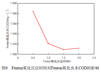 由圖6可見:反應時間為0.5 h時,出水COD較高,可以認為反應還沒有進行完全;反應時間延長至1.0 h時,COD迅速下降;繼續延長反應時間至2.0 h,COD降幅趨緩,僅下降了10 mg/L左右。在保證氧化效果的同時,反應時間越短越好,可減小池體容積、節省投資。因此,最佳Fenton氧化反應時間確定為1.0 h。