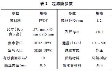 超濾設備為浸沒式超濾,采用錯流式過濾,設備外觀尺寸為970 mm× 820 mm× 1 100 mm,膜組件為3 組浸入式簾式中空纖維膜SMM-1010 超濾膜,超濾膜參數見表2.