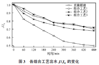 采用J /J0(其中J 為膜的實際通量,J0為膜的初始通量) 來表征組合工藝中超濾膜的污染情況.由圖3 可見,3種組合工藝中J /J0下降都比較平緩,并且均高于直接超濾.直接超濾工藝在運行一段時間后膜通量迅速下降,在超濾膜運行8 h 后降至原來的50%.這是因為水中的膠體或有機物積累在膜表面生成濃差極化層,同時雜質進入膜孔隙并吸附在膜內部,減少了有效的膜孔密度和膜孔徑的膜污染.由于印染廢水二級生化處理出水中懸浮物和膠體的含量大,而這些物質的粒徑均大于膜孔徑,直接采用超濾工藝處理,容易吸附在膜表面形成濾餅層,并且由于采用錯流過濾方式,使得膜表面局部污染物濃度增加,引起邊界流阻力增加,導致傳質推動力下降,造成濃差極化.組合工藝可以在印染廢水二級生化出水進入超濾工藝之前,對廢水進行一定的預處理,以截留降解廢水中的懸浮物膠體以及有機污染物,降低懸浮物、膠體以及大分子物質在超濾膜表面的沉積,從而減輕超濾膜的運行負荷.由圖3 可見,3種組合工藝中J /J0下降速率為組合工藝3 <組合工藝1 <組合工藝2,說明組合工藝3 能減輕濾餅層及濃差極化對超濾膜的污染.