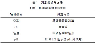 本試驗的測定指標與方法見表1。其中,COD、SS、色度均采用標準方法測定,pH值采用便攜式測試筆測定。
