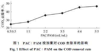由圖1可以看出,PAC∶PAM 為5∶5時,COD的去除率最高,為46.7%。但試驗過程中觀察到沉降效果并不好,絮體小且細。而PAC∶PAM 為2∶2時,形成的絮體密實,沉降性好,同時色度下降,上層溶液透明度提高,此時COD去除率為35.6%。綜合COD去除率及沉降效果來看,確定最佳PAC∶PAM 為2∶2。折算后,PAC的最佳投加量為1000mg/L,PAM 的最佳投加量為10mg/L。試驗結果與文獻報道的PAC投加量為5000mg/L,PAM 投加量為3.2mg/L的結論均較一般污水處理過程中的投加量大,這主要是因為處理對象為高濃度有機廢水的緣故。