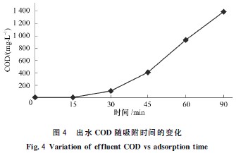 (4)活性炭吸附過程中,當吸附30min時,出水COD 為95.6mg/L,當吸附時間達到90min時,出水COD為1396.5mg/L。所以,活性炭吸附柱的穿透時間為30min左右,耗竭時間為90min左右。