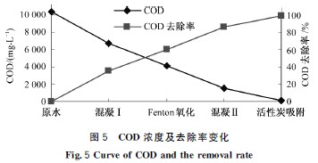 根據前述各處理工序的最佳條件控制,進行混凝Ⅰ-Fenton氧化-混凝Ⅱ-活性炭吸附處理,測定各工序的出水指標。活性炭吸附柱的出水采用吸附30min的數據。