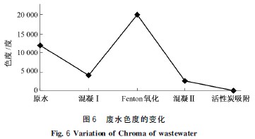 從圖6中數據變化可以看出,原水的色度為12000度,經過混凝Ⅰ處理后色度降為4000度,脫色率為66.7%。但經Fenton氧化后,廢水的色度急劇增加。這是因為Fenton氧化后產生的Fe3+具有顏色,造成廢水色度急增。Fenton氧化后的高色度廢水,經混凝Ⅱ處理后,色度降到2600度。最后經活性炭柱吸附后出水的色度降至0度,脫色率達到100%。