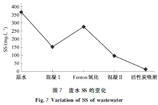 從圖7中可以看出,廢水經過混凝Ⅰ處理后SS濃度降低。但經Fenton氧化后的SS濃度增加,這主要是因為Fenton氧化后Fe3+形成絡合物沉淀,導致SS增加。經混凝Ⅱ處理后的SS濃度進一步降低,最后經活性炭吸附,出水的SS 為13.0mg/L,去除率達到96.4%。具體參見http://www.bnynw.com更多相關技術文檔。