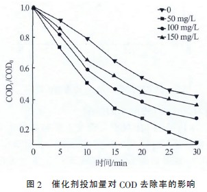 由圖2 可知,催化劑投加量對鉆井廢水COD去除率有很大的影響。當催化劑投加質量濃度從0 增加到50 mg/L 時,COD去除率從58%上升到88.7%,達到最大值,之后COD去除率隨著催化劑投加量的增加而下降,因此選擇50 mg/L 為催化劑最佳投加質量濃度。