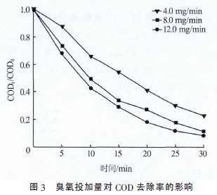 由圖3 可知,COD去除率隨著臭氧投加量的增加而增大。在臭氧投加量為4.0 mg/min,反應30 min時,COD去除率僅為77.13%,出水COD仍偏高,為286.79 mg/L;但是當臭氧投加量分別為8.0、12.0mg/min 時,反應30 min 后出水COD分別為141.70、108.05 mg/L,COD去除率分別達到了88.7% 、91.38%,出水COD均達到了《污水綜合排放標準》(GB 8978-1996)二級標準。這表明適當增加臭氧投加量可有效地提高催化臭氧化對鉆井廢水COD的去除率。但綜合處理效果和成本考慮,試驗選擇臭氧最佳投加量為8.0 mg/min。