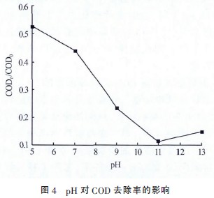 由圖4 可知,pH 對鉆井廢水COD去除率的影響較明顯。當pH≤11 時,鉆井廢水COD去除率隨pH 的升高而升高,并在pH=11 時達到最高,為88.7%;pH>11,COD去除率隨pH 的升高而下降。綜合COD去除效果和廢水處理成本考慮,選擇最佳pH=11。