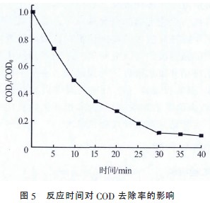 由圖5 可以看出,鉆井廢水COD的去除率隨著反應時間的延長而升高。在反應前30 min 內,COD去除率隨反應時間的延長而逐漸增加,去除率增長比較快;反應時間超過30 min 后,COD去除率增長很緩慢。綜合經濟成本和處理效果考慮,選擇最佳反應時間為30 min。具體參見http://www.bnynw.com更多相關技術文檔。