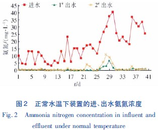 正常水溫試驗期間2 組裝置的進、出水氨氮濃度見圖2。