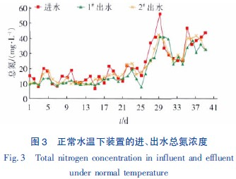 正常水溫試驗期間2 組裝置的進、出水總氮濃度見圖3。