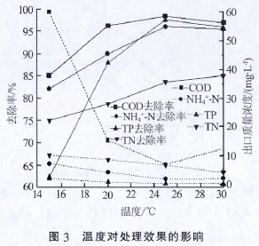 溫度是微生物生長的重要生態因子。而污水的生物處理實質是利用微生物體內的酶促生化反應來實現的代謝過程,因此酶本身所具有的蛋白質特性就決定了污水生物處理反應器必須在一定溫度范圍內運行才能取得良好的處理效果?刂茰囟葹15、20、25、30℃,研究溫度對SBR 系統污水處理效果的影響,結果見圖3。