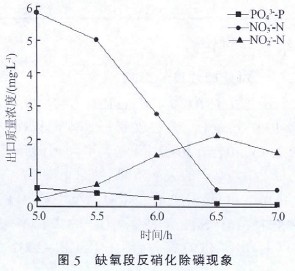 由圖5 可見:缺氧階段一開始NO3-濃度下降,磷酸鹽隨之下降,說明該過程中反硝化聚磷菌利用NO3-作電子受體進行了反硝化聚磷。當NO3-<2mg/L時,系統中的NO2-開始被消耗,表明反硝化聚磷菌開始利用NO2-進行缺氧吸磷。這里認為:當系統中NO3-和NO2-共存時,NO3-首先被消耗,但當NO3-濃度下降到一定程度時,NO2-隨之被消耗。通過計算可知缺氧段的反硝化除磷占整個除磷過程的9.3%。具體參見http://www.bnynw.com更多相關技術文檔。