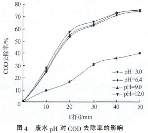 廢水pH 不同時,O3的氧化反應機理也不同,對處理效果會產生影響。控制O3的輸出量為2.61mg/min,催化劑的投加質量為4.9g,廢水初始pH 分別取3.0、6.4、9.0、12.0,總反應時間為50min,每隔10min取1 次樣,分別測定其COD,并計算COD 的去除率,結果見圖4。