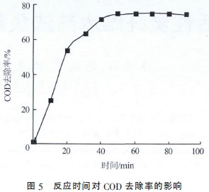 反應時間既影響處理效果,也影響實際運行成本的高低。控制O3的輸出量為2.61mg/min,廢水初始pH=6.4,催化劑的投加質量為4.9g,分別在反應時間為10、20、30、40、50、60、70、80、90min時取樣,測定其COD,并計算COD 的去除率,結果見圖5。
