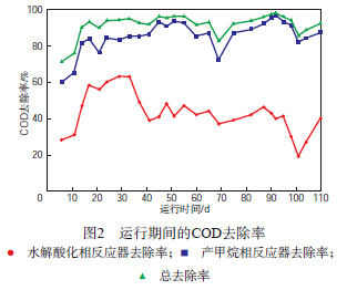 運行期間的COD去除率見圖2。由圖2可見:水解酸化相反應器運行的前34 d ,隨進水COD和容積負荷的提高,COD去除率呈上升趨勢;運行至35 d(稀釋比為10∶1)后,原水的微生物毒性有所表現,隨進水COD和容積負荷的提高,水解酸化相反應器的COD去除率有明顯下降趨勢;運行至100 d時,降低稀釋比至4∶1,水解酸化相反應器的COD去除率下降至19%,且伴隨出水及污泥的惡化。由此可見,為保證兩相厭氧反應器的長期穩定運行,調整稀釋比大于5∶1較適宜。由圖2還可見,在負荷提高及穩定運行階段,總COD去除率基本維持在90%以上,出水COD小于323 mg/L。