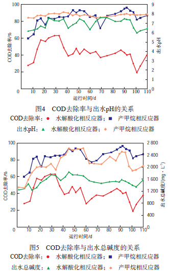 厭氧生化反應過程的pH和總堿度是系統穩定性的主要表觀參數,并且與COD去除率之間存在著密切聯系。COD去除率與出水pH和出水總堿度的關系分別見圖4和圖5。由圖4和圖5可見:在負荷提高及穩定運行階段,水解酸化相反應器和產甲烷相反應器的出水pH分別為6.2~7.6和7.6~8.1,出水總堿度分別為1 220~1 820 mg/L和1 800~2 620 mg/L;當水解酸化相反應器的COD去除率達到最高值(63%)時,水解酸化相反應器的出水pH為7.3,出水總堿度為1 730 mg/L;當產甲烷相反應器的COD去除率達到最高值(96%)時,產甲烷相反應器的出水pH為8.0,出水總堿度為2 510 mg/L;在惡化階段,水解酸化相反應器和產甲烷相反應器的出水pH均有所下降。其中,水解酸化相反應器的出水pH降幅較為明顯,同時兩相厭氧反應器的出水總堿度均有200~500 mg/L的降幅。