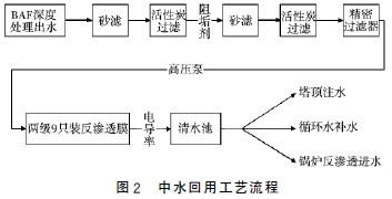 污水處理工藝流程、中水回用工藝流程分別見圖1、圖2。