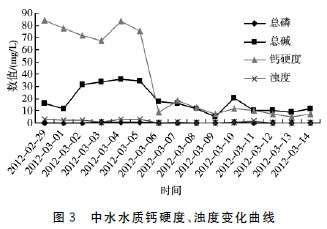 2012年3月6日反滲透膜投用前,鈣硬度、Cl-含量、鹽含量等數(shù)據(jù)相對(duì)偏高,回用到循環(huán)水后,對(duì)循環(huán)水的指標(biāo)存在一定影響,但是反滲透膜投用后,中水水質(zhì)有了很大提高(表3、圖3和圖4)。