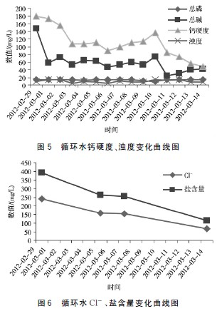 湛江公司中水回用水主要用于循環(huán)水補(bǔ)水,中水水質(zhì)情況對(duì)循環(huán)水影響較大(表4、圖5和圖6)。