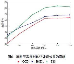 BAF中的生物膜是附著生長在填料上的,隨著廢水水質(zhì)的不同,微生物在填料層不同高度處的分布呈現(xiàn)不同的特點,主要是沿進水流向呈現(xiàn)出不同的微生物種類和數(shù)量,以及不同的生物膜厚度。所以填料層高度對去除效果和基建投資有很大影響。常溫下,當(dāng)氣水比為3∶1、廢水pH為 7.5、水力負荷為0.30 m3/(m2·h)時,填料層高度對BAF處理效果的影響見圖6。