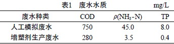增塑劑生產廢水取自江蘇某化工廠,為該廠廢水處理設施物化處理單元出水。由于好氧顆粒污泥在人工模擬廢水(主要以葡萄糖、乙酸鈉、氯化銨、磷酸二氫鉀及其他微量元素等配制而成)中培養,因此實驗開始階段將增塑劑生產廢水混入人工模擬廢水中,逐漸增加增塑劑生產廢水占進水的體積分數(以體積分數10%~20%的比例增加),最終進水全部為增塑劑生產廢水,以實現對好氧顆粒污泥的馴化。廢水水質見表1。