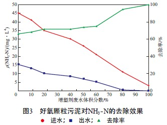 好氧顆粒污泥對NH3-N的去除效果見圖3。由圖3可見:在運行初始階段,人工模擬廢水中ρ(NH3-N)較高,達到45.0 mg/L,出水ρ(NH3-N)為15.0 mg/L,NH3-N去除率為66%;增塑劑生產廢水中ρ(NH3-N)較低,只有3.5 mg/L,因此,隨著進水中增塑劑生產廢水體積分數增加,進水ρ(NH3-N)持續降低,出水ρ(NH3-N)相應下降,NH3-N去除率緩慢增大;當增塑劑生產廢水體積分數為60%時,出水ρ(NH3-N)為5.3 mg/L,NH3-N去除率為75%;當增塑劑生產廢水體積分數為80%時,出水ρ(NH3-N)只有0.6 mg/L,NH3-N去除率接近95%;而進水全部為增塑劑生產廢水時,出水ρ(NH3-N)未檢出。有研究表明[13]:硝化細菌因為生長周期比較長,需要較長的污泥停留時間,因而它更“傾向”于存在于固定相中,反應器的選擇壓力大,絮體被洗出,沉降性能好的被好氧顆粒污泥保存下來,從而增加了反應器內硝化菌的濃度,因此好氧顆粒污泥對NH3-N具有較好的去除效果。而由于增塑劑生產廢水的ρ(NH3-N)只有3.5 mg/L,所以好氧顆粒污泥通過同化作用及氨化作用可將其完全去除。