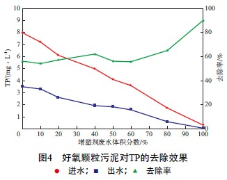 由圖4可見:在運行初始階段,人工模擬廢水中TP較高,達到8.00 mg/L,出水TP為3.50 mg/L,TP去除率為56%;增塑劑生產廢水中TP低,只有0.40 mg/L,因此,隨著好氧顆粒污泥進水中增塑劑廢水體積分數增加,進水TP持續降低,出水TP相應下降,TP去除率緩慢增加,在增塑劑生產廢水體積分數為80%時,出水TP為0.60 mg/L,TP去除率為65%;進水全部為增塑劑生產廢水時,出水TP為0.03 mg/L,去除率超過了90%。在傳統活性污泥法中,廢水中TP的去除主要是通過將富磷污泥以剩余污泥的形式排放而去除的。在好氧顆粒污泥體系中,顆粒污泥致密,沉降性能良好,排放的污泥量比較少,因此系統對磷的去除率整體不高。而由于增塑劑廢水TP只有0.40 mg/L,所以好氧顆粒污泥通過同化作用可將磷大部分去除,因而出水中磷的含量很低,小于0.10 mg/L。具體參見http://www.bnynw.com更多相關技術文檔。